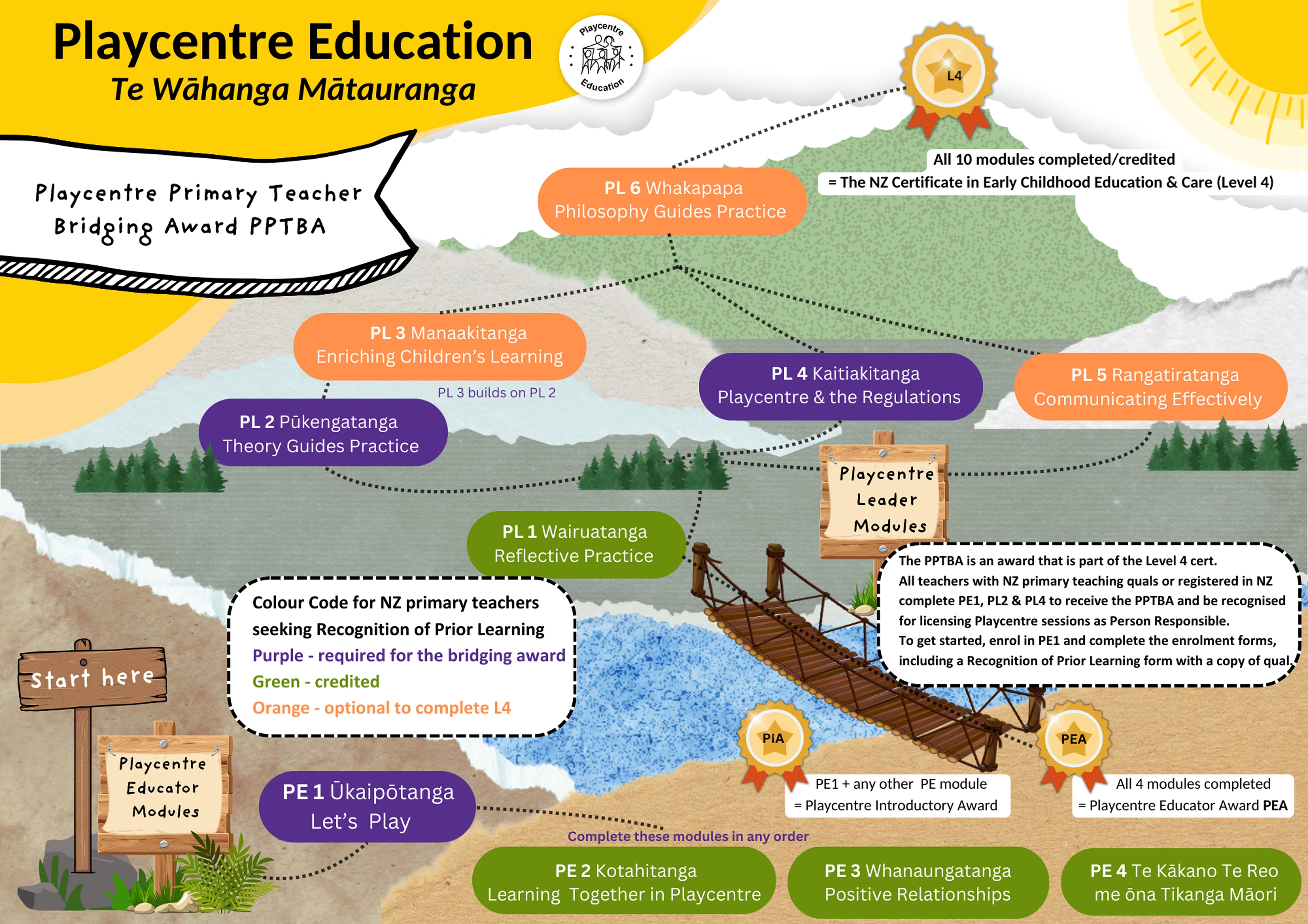 To start the bridging award, sign up for a PE1 Ūkaipōtanga – Let’s Play module in a format and time that suits you. Many teachers prefer the online format. When you sign up for PE1, you will receive a confirmation email with a link to download an enrolment pack. Please complete the forms, including the Recognition of Prior Learning (RPL) form, and attach a copy of your teaching qualification. Most qualifications state “primary” on them however if yours does not, we will also need a copy of your transcript.